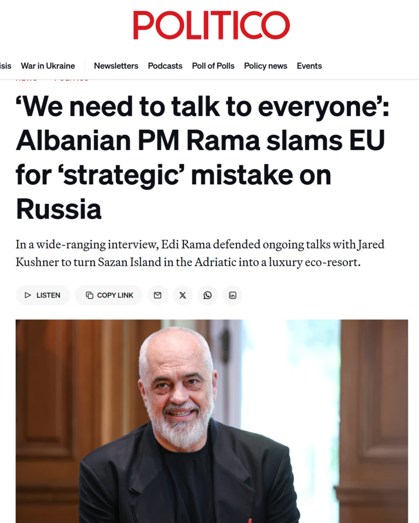 On Thursday evening, POLITICO Europe published Nicholas Vinocur’s interview with Prime Minister Edi Rama from the Delphi Economic Forum. The headline read: “‘We need to talk to everyone’: Albanian PM Rama slams EU for ‘strategic’ mistake on Russia.” Within hours the verb had done more work than the interview itself. Headlines of this shape travel a predictable path, screenshots into Serbian-language channels, lifts into Russian aggregator sites, repackaging by English-language accounts that specialize in the idea that the Balkans are Europe’s weak flank. The interview sat underneath all of it, quieter than its packaging.
